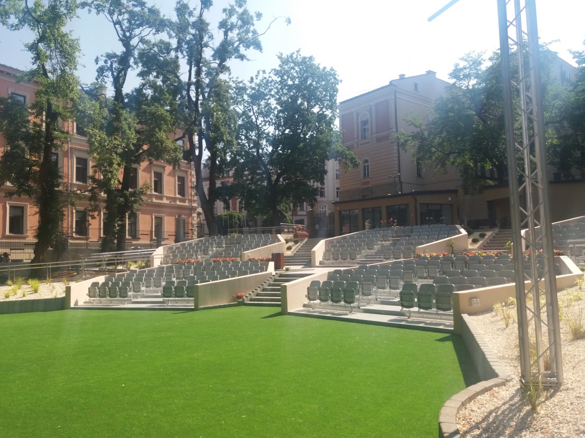 Przypomnijmy, miejscy aktywiści, którzy dzięki budżetowi rozpoczęli wskrzeszanie amfiteatru, chcieli żeby była to przestrzeń niezabudowana na stałe krzesłami, żeby służyła różnym aktywnościom. Początkowo miasto na to przystawało. Jednak później koncepcja się zmieniła, bo zdaniem prezydenta Romana Ciepieli było oczekiwanie od starszych mieszkańców, żeby mieli na czym usiąść. Aktywiści przekonywali, że to ograniczy funkcjonalność tego miejsca. Ostatecznie miasto zrezygnowało z jednego rzędu krzeseł na rzecz trawy i nazywa to kompromisem. Dodatkowo między krzesełkami a sceną wyłożono sztuczną trawę.