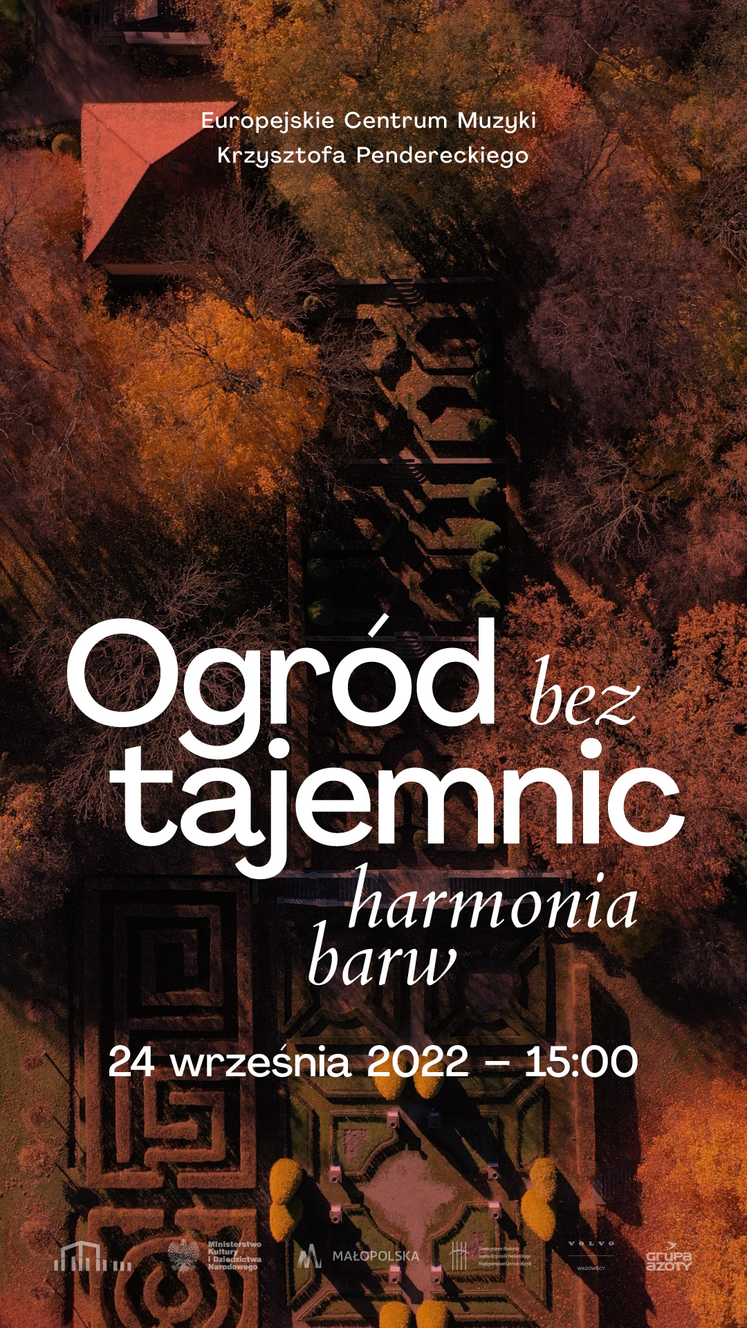 Europejskie Centrum Muzyki Krzysztofa Pendereckiego zaprasza na otwarcie jesiennego sezonu, które odbędzie się 24 września. Wraz z nastaniem jesieni dla gości przygotowano specjalną ofertę OGRÓD BEZ TAJEMNIC – HARMONIA BARW, czyli absolutnie wyjątkowy spacer po Arboretum wraz z ogrodnikiem Stanisławem Dudkiem – wieloletnim opiekunem lusławickiego parku Krzysztofa Pendereckiego.