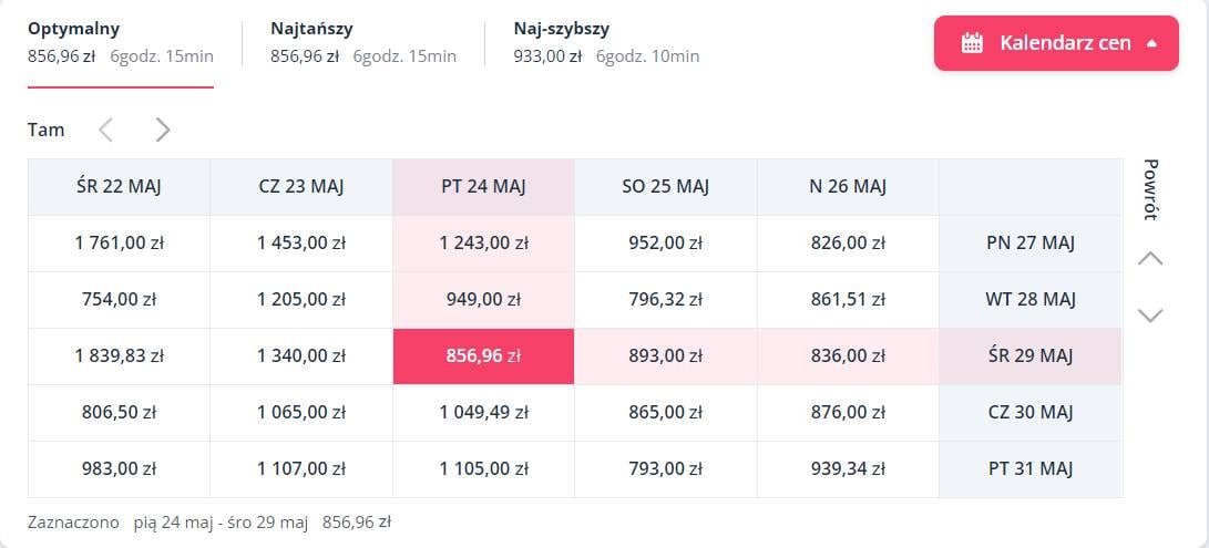 Kalendarz cen na Tickets.pl pomaga znaleźć przystępny bilet, jeśli klient może podróżować w elastycznych terminach. Użytkownik może sprawdzić koszt biletów w określonym okresie, aby wybrać najlepsze daty i ceny na podróż.