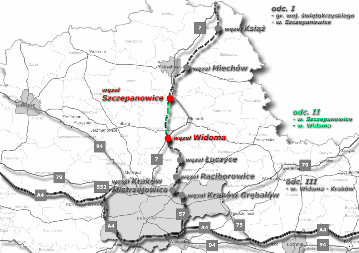 Prawie 56-km odcinek S7 od granicy woj. świętokrzyskiego do węzła Igołomska w Krakowie został podzielony na trzy części realizacyjne. Są to: odcinek od granicy województwa świętokrzyskiego do węzła Szczepanowice (bez węzła) - długość ok. 23 km; odcinek węzeł Szczepanowice (z węzłem) do węzła Widoma (z węzłem) - długości ok. 14 km oraz odcinek węzeł Widoma (bez węzła) do granic Krakowa (z włączeniem do węzła Igołomska) - długości ok. 18 km.