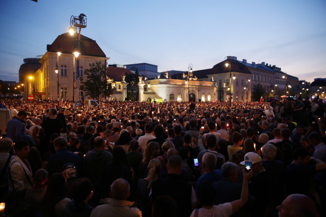 Uczestnicy akcji "Łańcuch światła" pod hasłem "Wolne sądy! Chcemy weta!" protestują ze świecami przed Pałacem Prezydenckim w Warszawie
