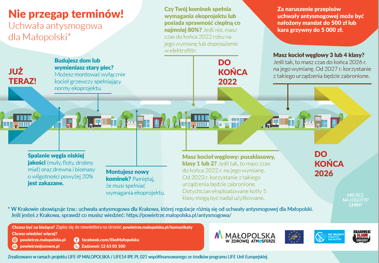 W gminach Niepołomice, Krzeszowice, Skawina, Rabka Zdrój, Czarny Dunajec oraz miast Oświęcim i Nowy Targ regulacje Lokalnych Uchwał Antysmogowych zakładają m.in. całkowite odejście od węgla od 2030 roku.