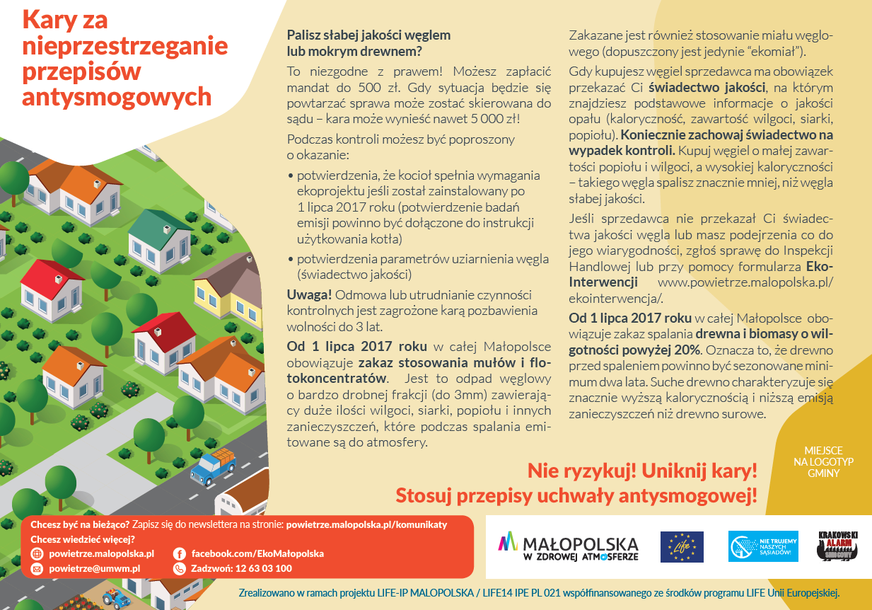Uwaga! Warto pamiętać, że użytkownik instalacji, który nie przestrzega przepisów uchwały antysmogowej, może zostać ukarany mandatem do 500 zł. Kontrolujący – pracownik urzędu gminy lub straży gminnej - może również skierować wniosek do sądu o ukaranie karą grzywny do 5 tys. zł. Karę można nałożyć ponownie przy każdym wykryciu przypadku naruszenia zapisów uchwały antysmogowej.