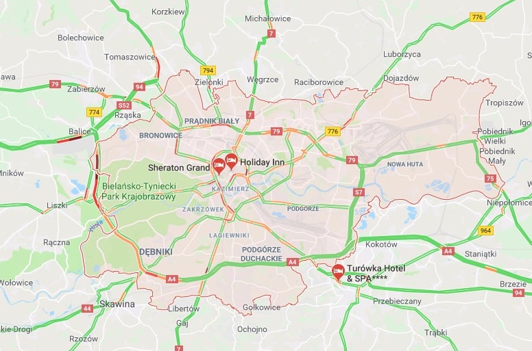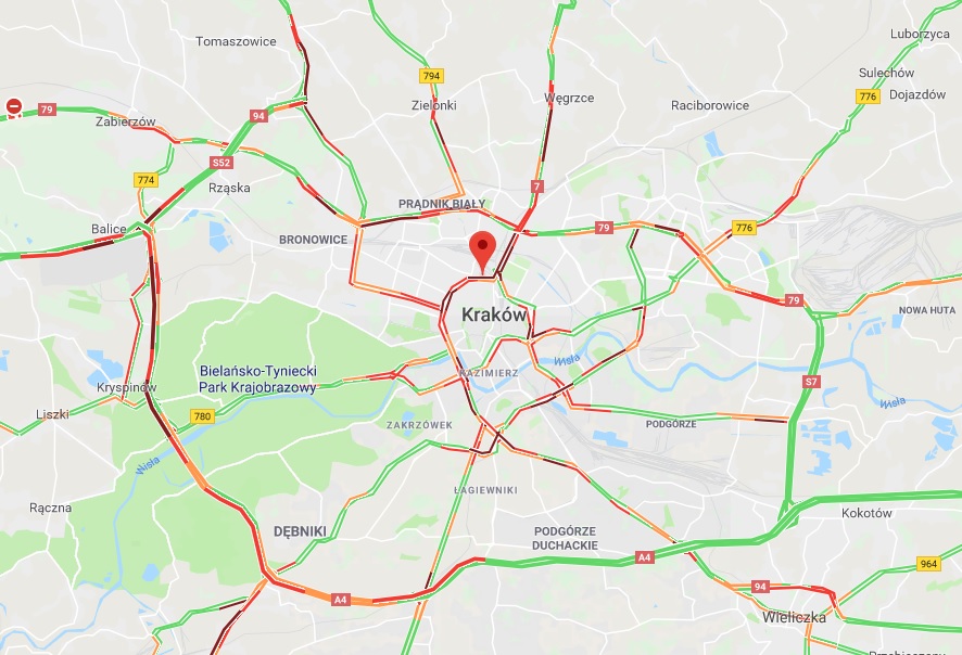 16:02 - Tak prezentuje się Kraków na mapach Google. Niby wiosna, a czerwień zdominowała zieleń.