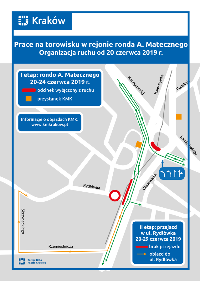 Wymienione zostaną szyny na części przejazdu drogowego w rondzie oraz w części ul. Wadowickiej i przejeździe drogowym w ul. Rydlówka. Kierowcy poruszający się w kierunku Wieliczki muszą liczyć się z niedogodnościami od 20 do 24 czerwca. Na ul. Konopnickiej dostępny będzie jeden pas ruchu do jazdy na wprost (buspas w tym miejscu zostanie zlikwidowany) oraz dwa – do skrętu w prawo w ul. Wadowicką. Przejazd drogowy w ul. Rydlówka zostanie zamknięty. Prace w tym miejscu prowadzone będą do 29 czerwca. Będzie możliwość objazdu ul. Rzemieślniczą i Skrzyneckiego.