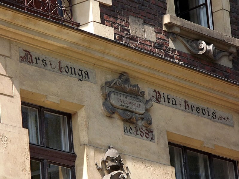 Inskrypcja na fasadzie kamienicy "Festina Lente"