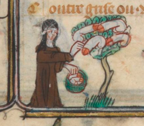 Falliczne drzewko na marginesie rękopisu Powieści o Róży, Paryż, połowa XIV wieku (Bibliothèque nationale de France, MS. Fr. 25526), Jeanne de Montbaston, fol. 106v.