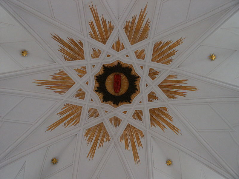 Przedstawienie języka św. Jana Nepomucena otoczonego promieniami, sklepienie w Sanktuarium św. Jana Nepomucena (Zelená Hora), Zdziar nad Sazawą, Czechy.