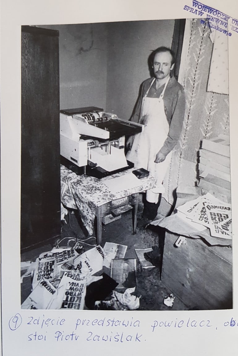 Dokumentacja z likwidacji nielegalnej drukarni przy ul.Sielskiej. Zdjęcie operacyjne SB. Fot.AIPN