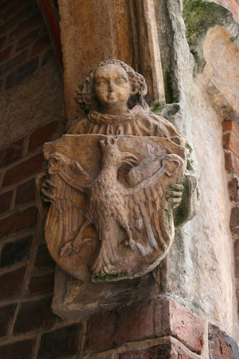 Rzeźbiony wspornik przy wejściu do kościoła św. Barbary