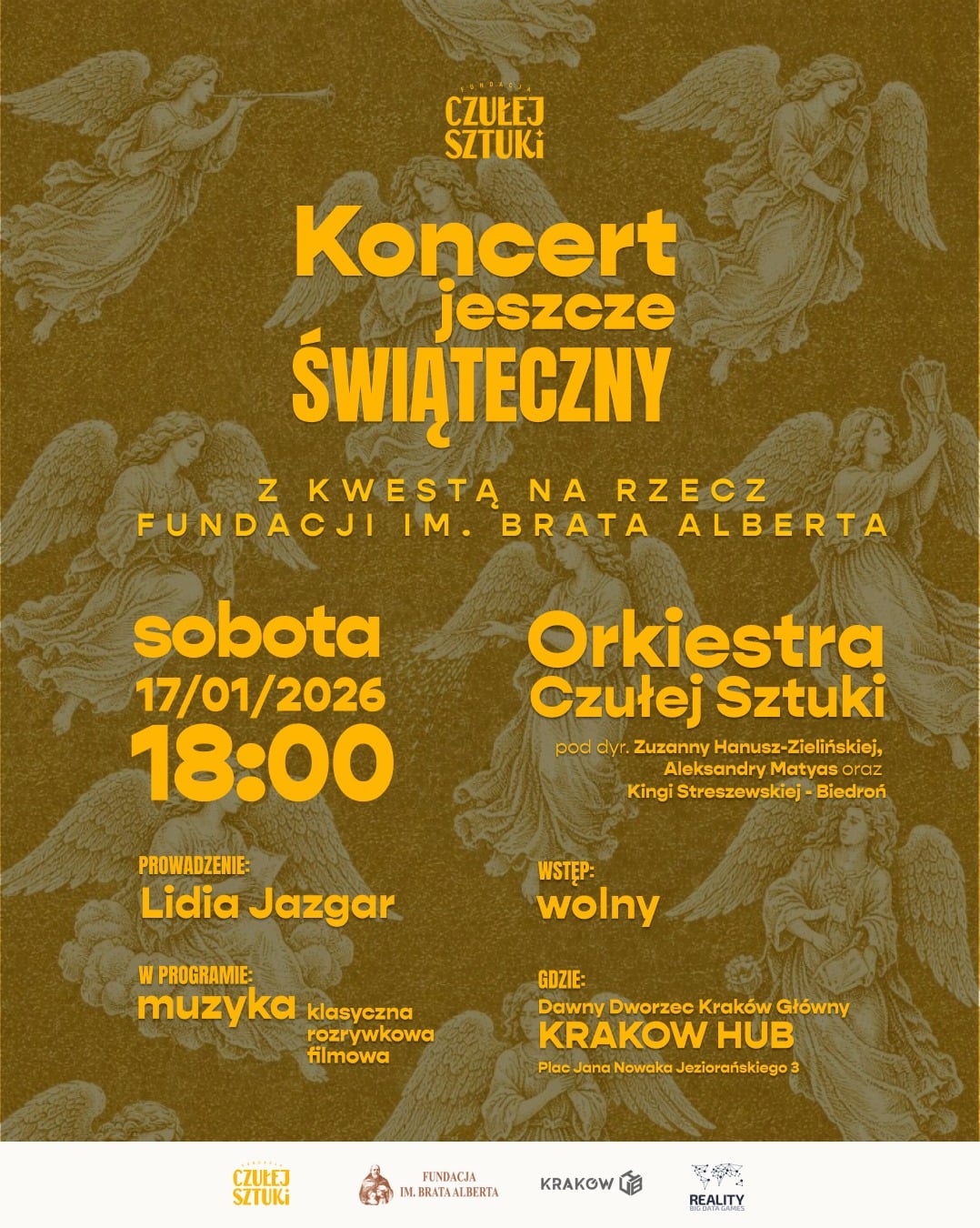 Już w sobotę 17 stycznia o godz. 18.00 w Kraków Hub (dawny budynek dworca Kraków Główny, plac Jana Nowaka-Jeziorańskiego) odbędzie się koncert charytatywny na rzecz Fundacji im. Brata Alberta. Wystąpi Orkiestra Czułej Sztuki – zespół złożony z dorosłych pasjonatów muzyki, działający w ramach warsztatów „Zróbmy orkiestrę”.