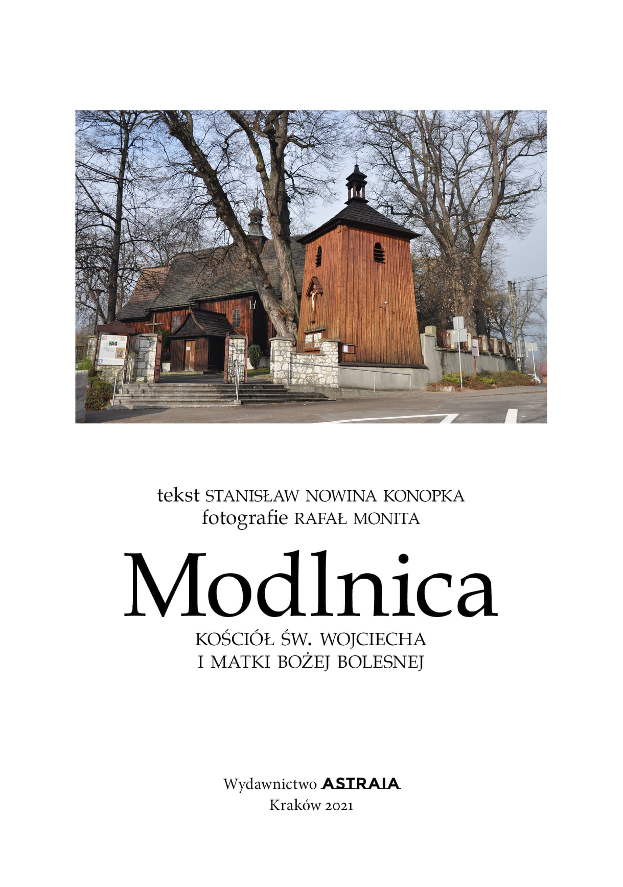 Modlnicki kościół wzniesiony w 1553 r. doczekał się pierwszego, obszernego, albumowego opracowania, które daje gruntowny obraz jego dziejów wraz z obszernym opisem wyposażenia, przywołując również historię związanych z nim osób. Silna więź autora Stanisława Nowina Konopki z tym miejscem wynika z ponad 200-letniej obecności rodziny Konopków w Modlnicy, gdzie dwór i kościół były zawsze ze sobą nieomal organicznie związane. Ta trwająca do dzisiaj więź zainspirowała młodego autora do napisania książki, w której historia drewnianej świątyni wzbogacona jest o niepublikowane dotąd prastare wspomnienia rodzinne. Tekstowi towarzyszą liczne zdjęcia Rafała Monity uzupełnione ciekawymi zdjęciami archiwalnymi.