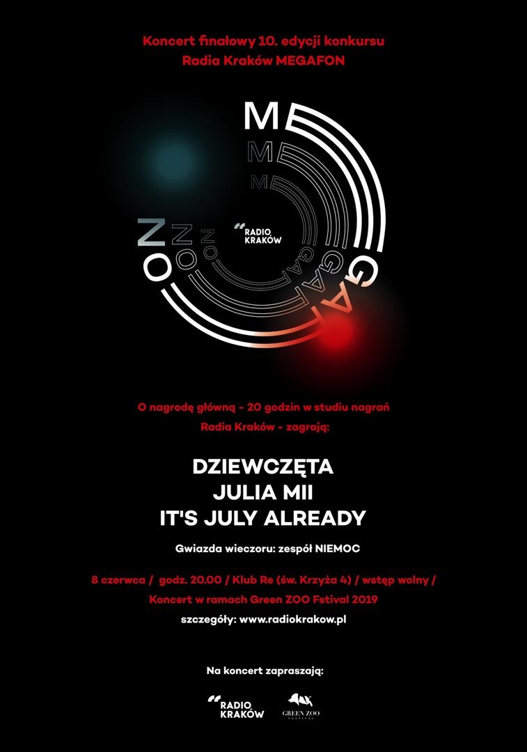 10. edycja Megafonu zakończyła się koncertowo! W klubie Re o zwycięstwo w konkursie zagrały trzy zespoły: Dziewczęta, Julia Mii oraz It's July Already. Głosami jury do grona dziewięciu dotychczasowych laureatów Megafonu dołączył zespół It's July Already.Dzięki zwycięstwu muzycy będą mogli pracować nad nowym materiałem w studiu nagrań Radia Kraków. Nagrodzeni zostali jednak wszyscy finaliści - utwory zarówno It's July Already, jak również zespołu Dziewczęta oraz Julia Mii dołączą do tracklisty najnowszej płyty Radia Kraków prezentującej najlepszą młodą muzykę z Małopolski. Składanka podsumuje dziesięć edycji konkursu "Megafonu". Premiera już wkrótce.