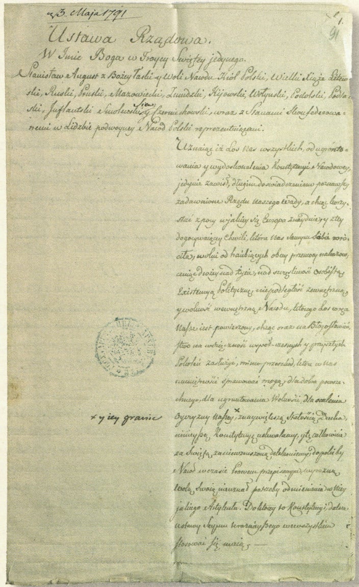 Stanisław August z Bożej łaski i woli Narodu Król Polski, Wielki Książe Litewski, Ruski, Pruski, Mazowiecki, Żmudzki, Kijowski, Wołyński, Podolski, Inflancki, Smoleński, Siewierski i Czerniechowski, wraz z stanami skonfederowanemi, w liczbie podwójnej Naród Polski reprezentującemi, uznając, iż los nas wszystkich od ugruntowania i wydoskonalenia konstytucji narodowej jedynie zawisł, długim doświadczeniem poznawszy zadawnione rządu naszego wady, a chcąc korzystać z pory, w jakiej się Europa znajduje, i z tej dogorywającej chwili, która nas samym sobie wróciła, wolni od hańbiących obcej przemocy nakazów, ceniąc drożej nad życie, nad szczęśliwość osobistą egzystencyją polityczną, niepodległość zewnętrzną i wolność wewnętrzną narodu, którego los w ręce nasze jest powierzony, chcąc oraz na błogosławieństwo, na wdzięczność współczesnych i przyszłych pokoleń zasłużyć, mimo przeszkód, które w nas namiętności sprawować mogą, dla dobra powszechnego, dla ugruntowania wolności, dla ocalenia ojczyzny naszej i jej granic, z największą stałością ducha niniejszą konstytucję uchwalamy i tę całkowicie za świętą, za niewzruszoną deklarujemy, dopóki by naród w czasie, prawem przepisanym, wyraźną wolą swoją nie uznał potrzeby odmienienia w niej jakiego artykułu. Do której to konstytucji dalsze ustawy sejmu teraźniejszego we wszystkiem stosować się mają."