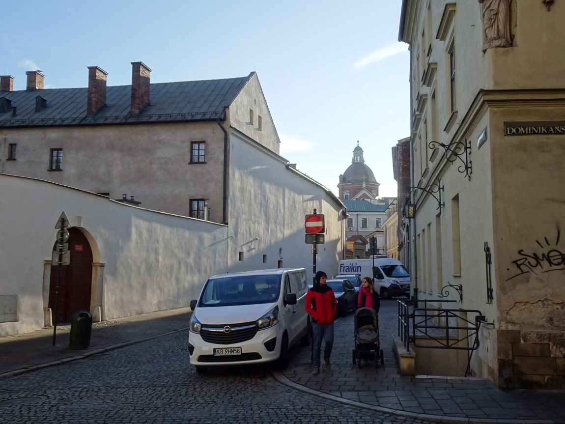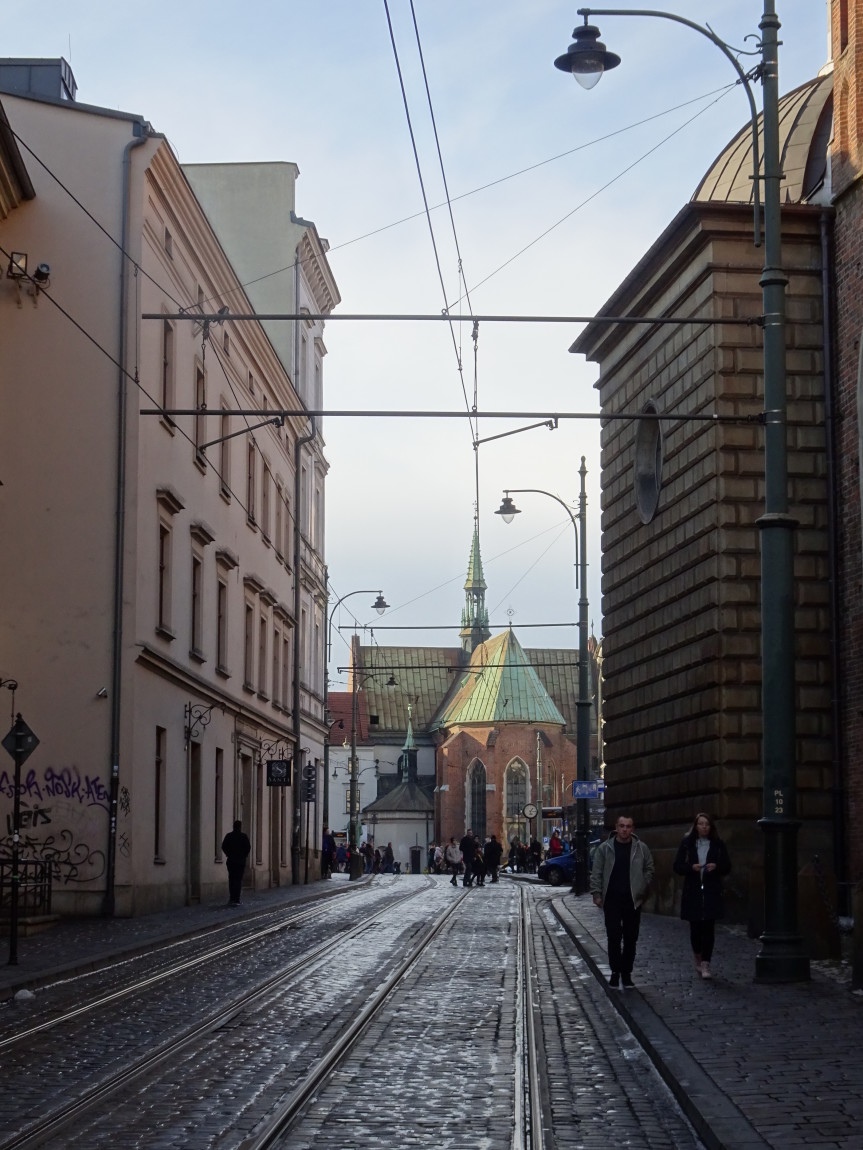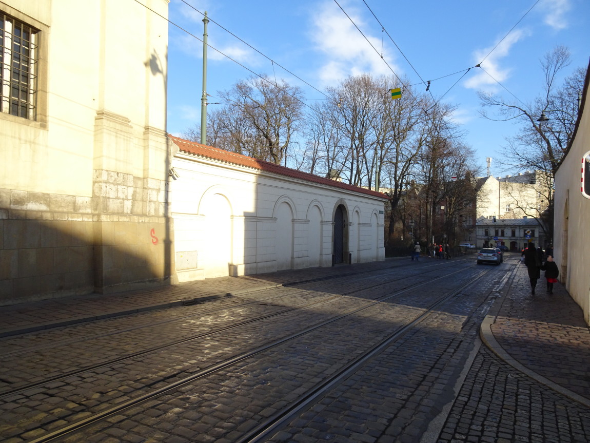 Specjalnie dla Państwa usadza się tu kawałeczek Planu Kołłątajowskiego (przypomnijmy - z 1785 r.) ustawiony dla trudności zagadki "do góry nogami". Gdzie Plan ma nogi? Zwykle na południu. Słowem tu widzimy południe na górze - a północ na dole mapki. Widzimy zatem i nawę kościoła św. Trójcy po lewej, i istniejący jeszcze kościół Wszystkich Świętych - po prawej (tzw. kościół wydziałowy Wydziału Prawa Akademii Krakowskiej, dzień dobry Panie Mecenasie...), uliczkę Poselską zgrabnie przechodzącą w uliczkę przymurną poniżej nawy kościoła dominikanów. Pl. Dominikański jest jeszcze ulicą Szeroką - i w istocie szerszy jest od placu dzisiejszego a ul. Dominikańska? Jeszcze nie istnieje. Powstanie dopiero w r. 1824. Tramwaj pojawi się na niej po raz pierwszy dopiero na planie miasta z r. 1913, tj., prawie 90 lat później.Kaplice południowej nawy kościoła sąsiadują o włos z linią tramwajową i jest to najbliższe w Krakowie usytuowanie przejeżdżających tramwajów przy murze. Drgania wywoływane przejazdami ciężkich wozów po marnym torowisku powodowały konieczność niezliczonych prac konserwatorskich. Teraz jest znacznie lepiej. Cywilizacja (: Przy okazji ulubiony widok "pocztówkowy" na kościół franciszkanów - w głębi.