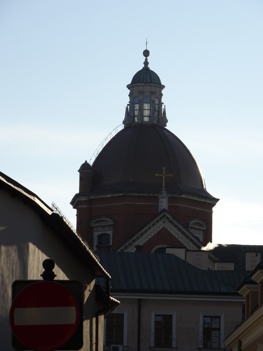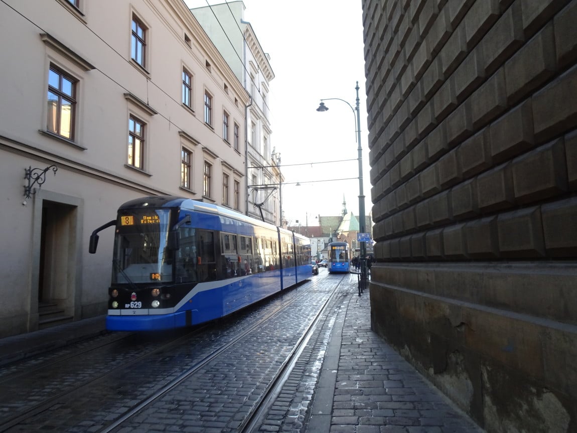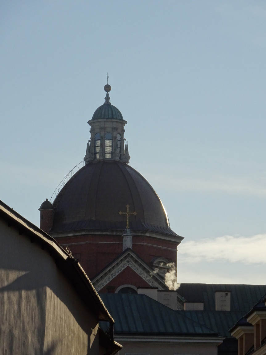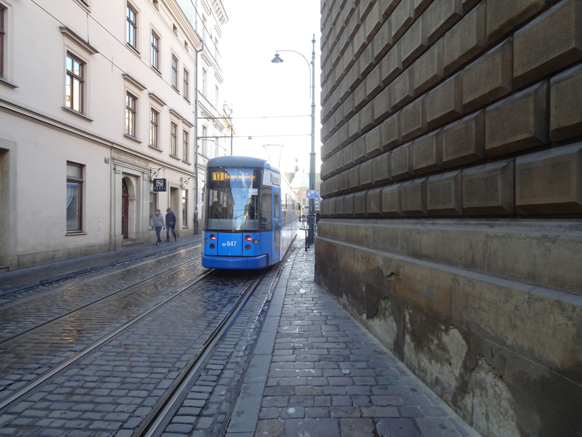 Specjalnie dla Państwa usadza się tu kawałeczek Planu Kołłątajowskiego (przypomnijmy - z 1785 r.) ustawiony dla trudności zagadki "do góry nogami". Gdzie Plan ma nogi? Zwykle na południu. Słowem tu widzimy południe na górze - a północ na dole mapki. Widzimy zatem i nawę kościoła św. Trójcy po lewej, i istniejący jeszcze kościół Wszystkich Świętych - po prawej (tzw. kościół wydziałowy Wydziału Prawa Akademii Krakowskiej, dzień dobry Panie Mecenasie...), uliczkę Poselską zgrabnie przechodzącą w uliczkę przymurną poniżej nawy kościoła dominikanów. Pl. Dominikański jest jeszcze ulicą Szeroką - i w istocie szerszy jest od placu dzisiejszego a ul. Dominikańska? Jeszcze nie istnieje. Powstanie dopiero w r. 1824. Tramwaj pojawi się na niej po raz pierwszy dopiero na planie miasta z r. 1913, tj., prawie 90 lat później.Kaplice południowej nawy kościoła sąsiadują o włos z linią tramwajową i jest to najbliższe w Krakowie usytuowanie przejeżdżających tramwajów przy murze. Drgania wywoływane przejazdami ciężkich wozów po marnym torowisku powodowały konieczność niezliczonych prac konserwatorskich. Teraz jest znacznie lepiej. Cywilizacja (: Przy okazji ulubiony widok "pocztówkowy" na kościół franciszkanów - w głębi.