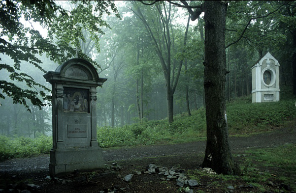 Góry Bardzkie, Bardzka Góra (Kalwaria), kapliczki pątnicze. Na pierwszym planie stacja Drogi Krzyżowej (XIX w.), po prawej widoczna jedna z kaplic Siedmiu Boleści Marii (XVIII w.).