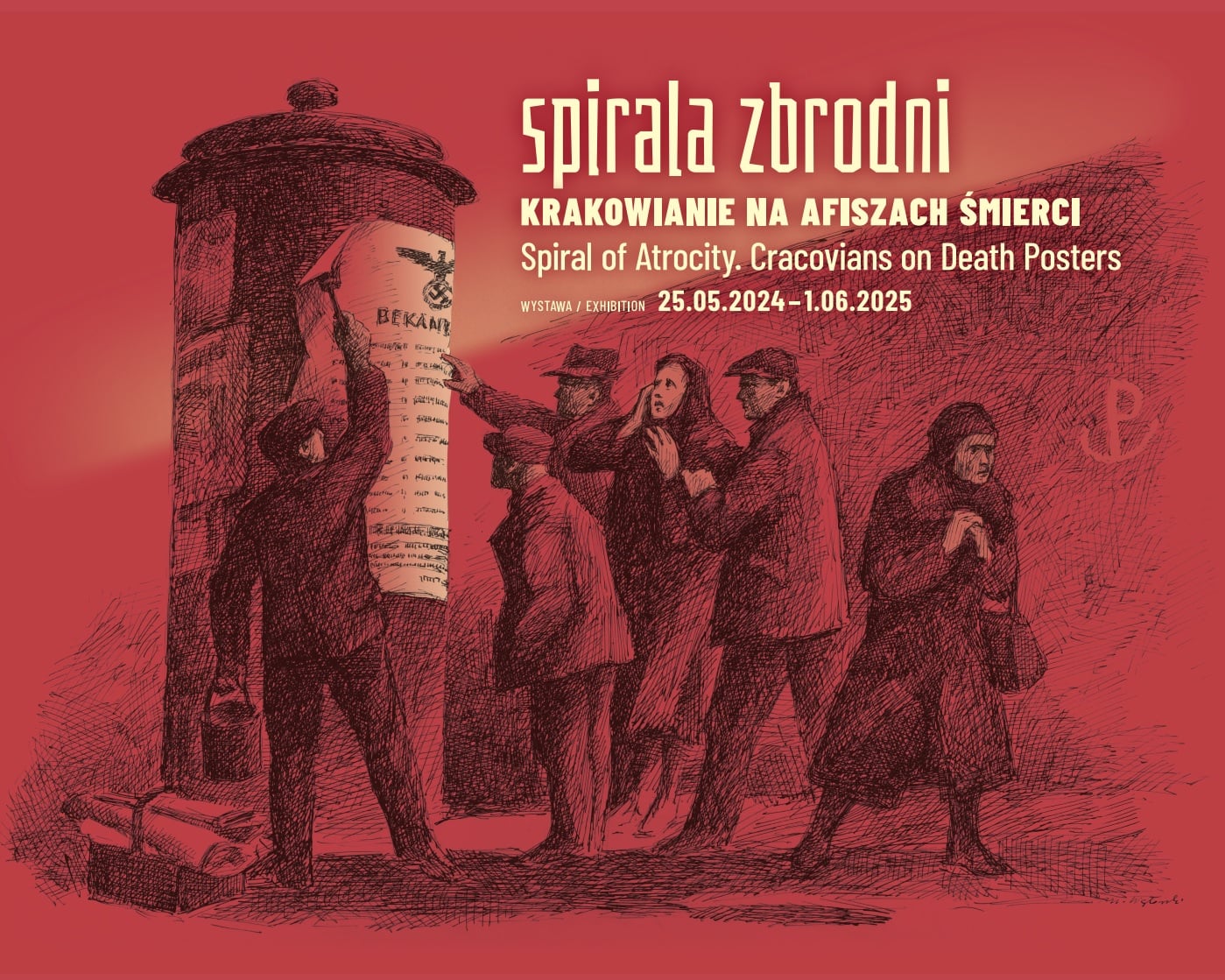 „Spirala zbrodni …” opowiada tragiczne historie krakowian, których nazwiska znalazły się na afiszach śmierci. Prezentowane są oryginalne obwieszczenia, świadectwa rodzin ofiar, pamiątki po zamordowanych, sylwetki ofiar i sprawców, dokumenty z instytucji zajmujących się okresem okupacji niemieckiej w Krakowie.