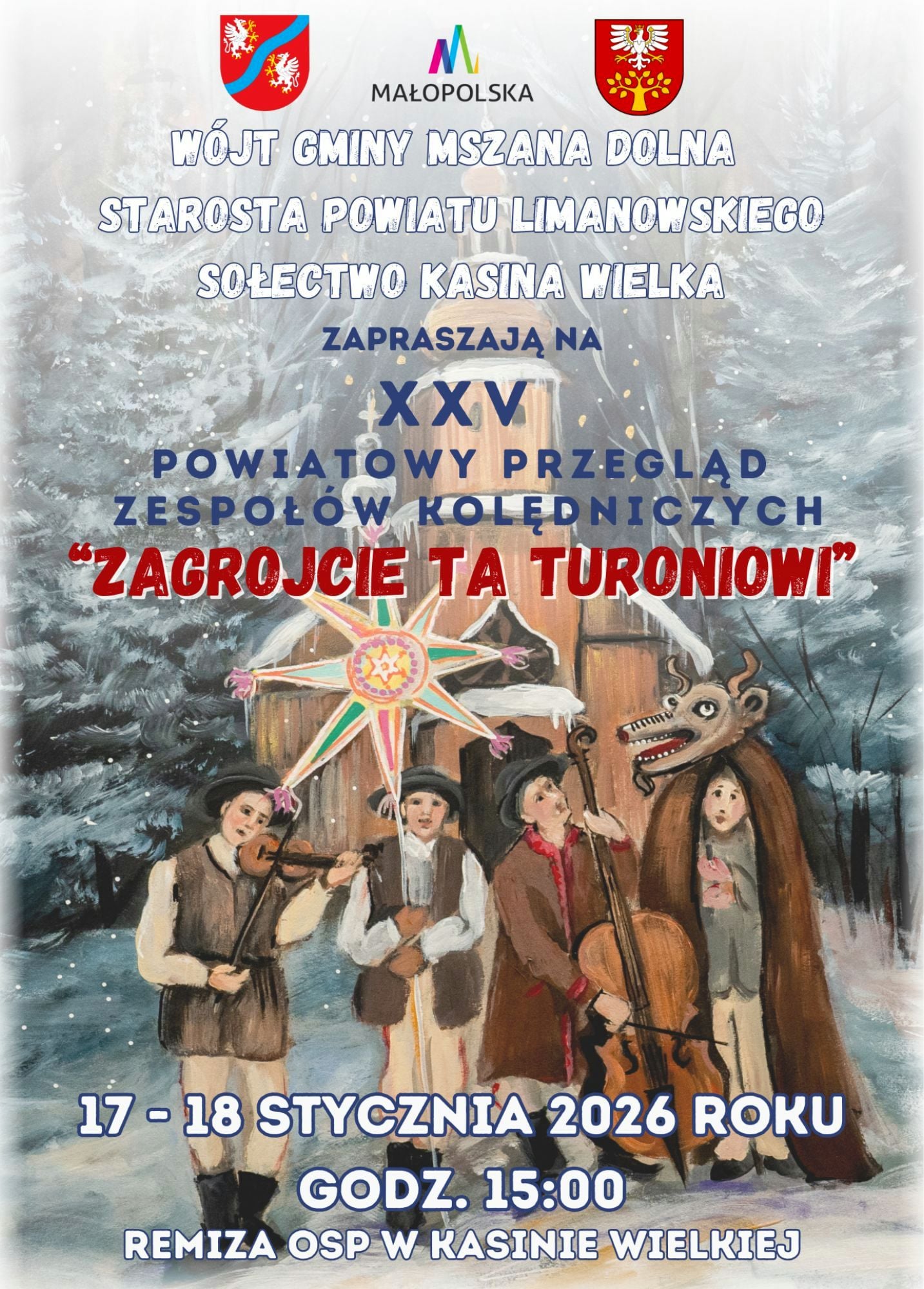 W sobotę 17.01. i w niedzielę 18.01. 2026 r. w Remizie Ochotniczej Straży Pożarnej w KASINIE WIELKIEJ odbędzie się jubileuszowy XXV Powiatowy Przegląd Zespołów Kolędniczych "ZAGRAJCIE TA TURONIOWI".