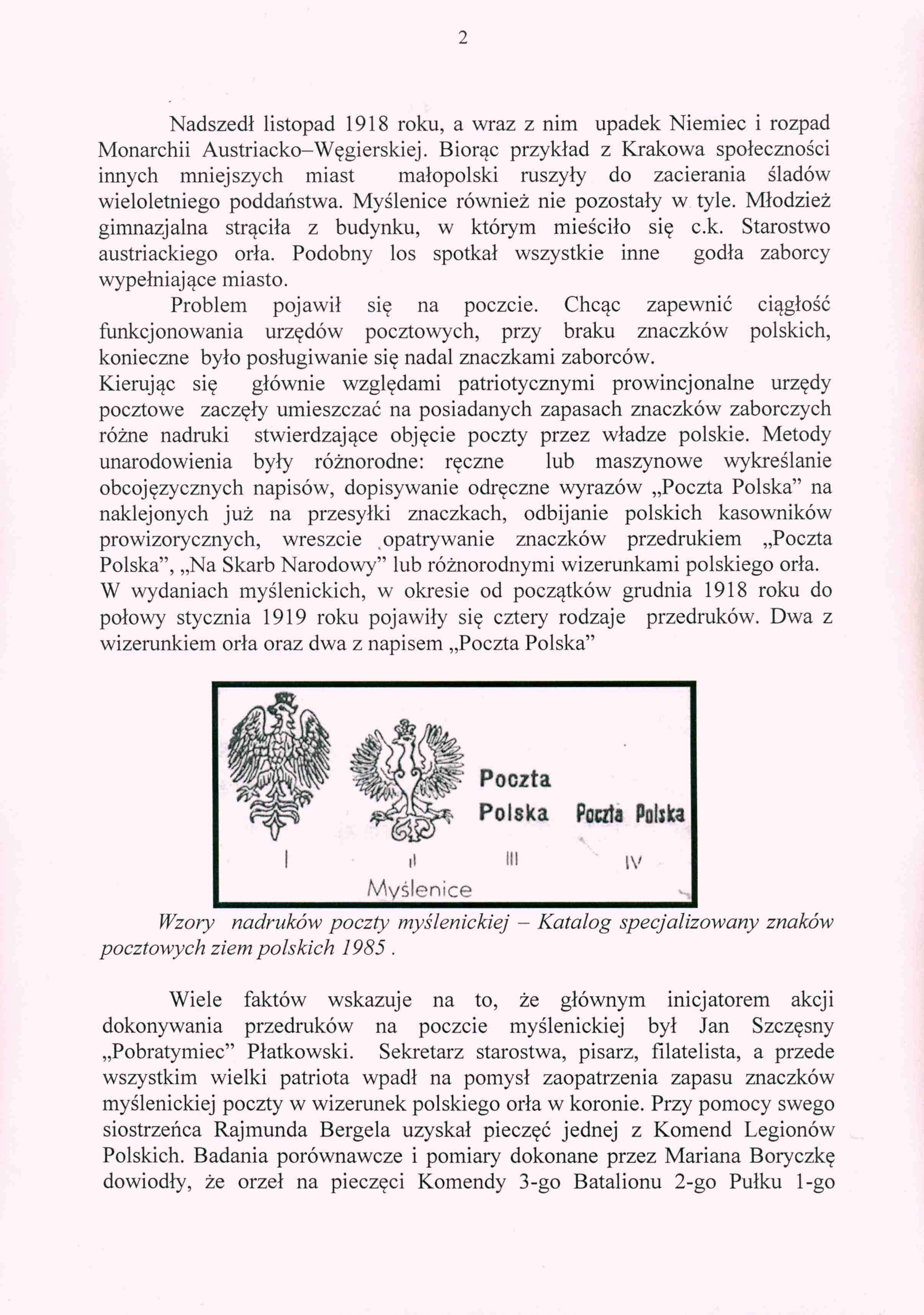 W Myślenicach głównym inicjatorem takich działań był JAN SZCZĘSNY "POBRATYMIEC" PŁATKOWSKI, sekretarz starostwa, pisarz, filatelista i żarliwy patriota.