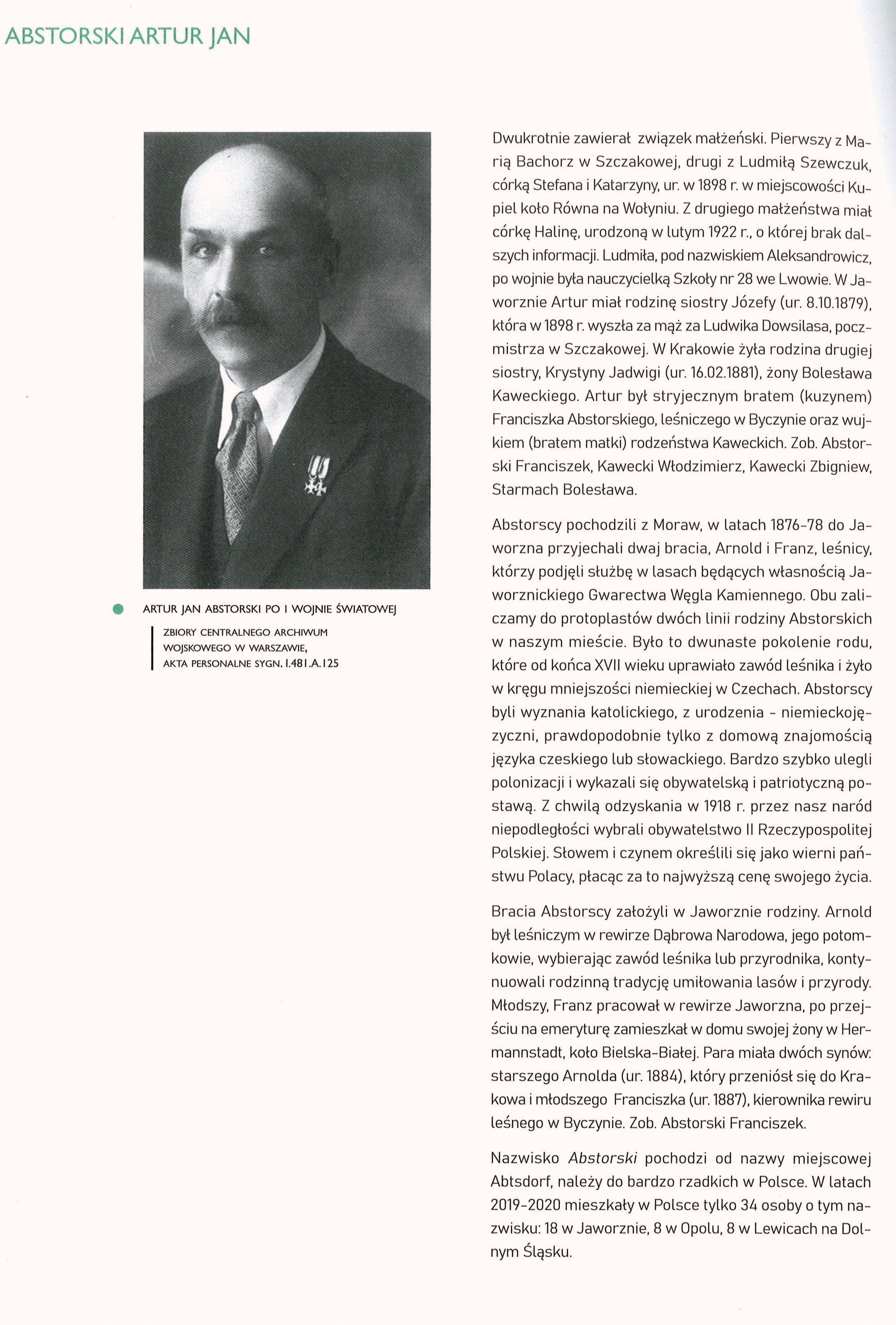 W nim zamieściła biogram urodzonego w 1888 r. w Dąbrowie Narodowej ARTURA JANA ABSTORSKIEGIO, leśnika, żołnierza I wojny światowej oraz walki o granice niepodległej Polski, więźnia sowieckich Łagrów, uczestnika Bitwy o Monte Cassino, który zmarł na emigracji w LONDYNIE w 1955 r.