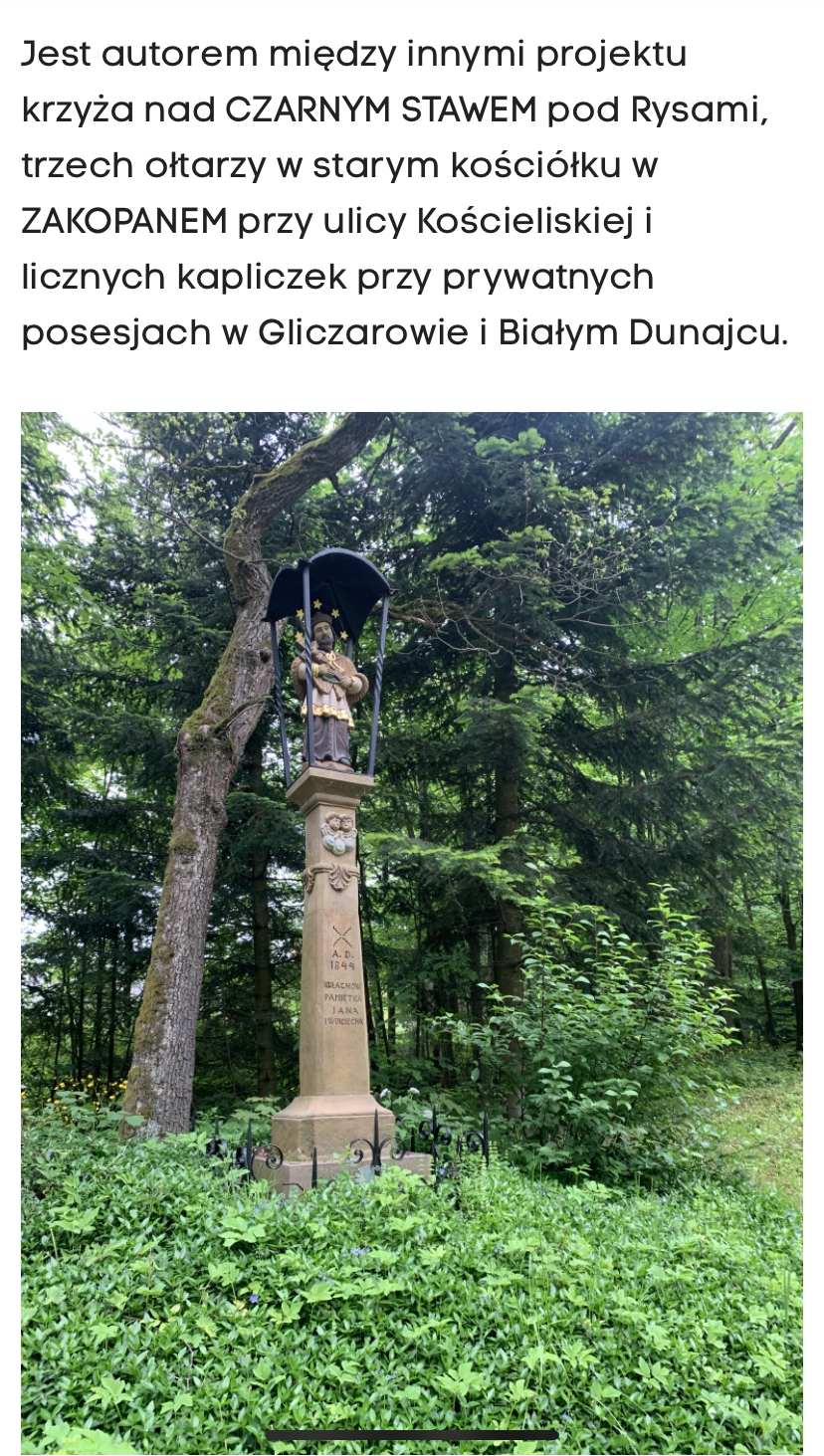 Jest autorem między innymi projektu krzyża nad CZARNYM STAWEM pod Rysami, trzech ołtarzy w starym kościółku w ZAKOPANEM przy ulicy Kościeliskiej i licznych kapliczek przy prywatnych posesjach w Gliczarowie i Białym Dunajcu.