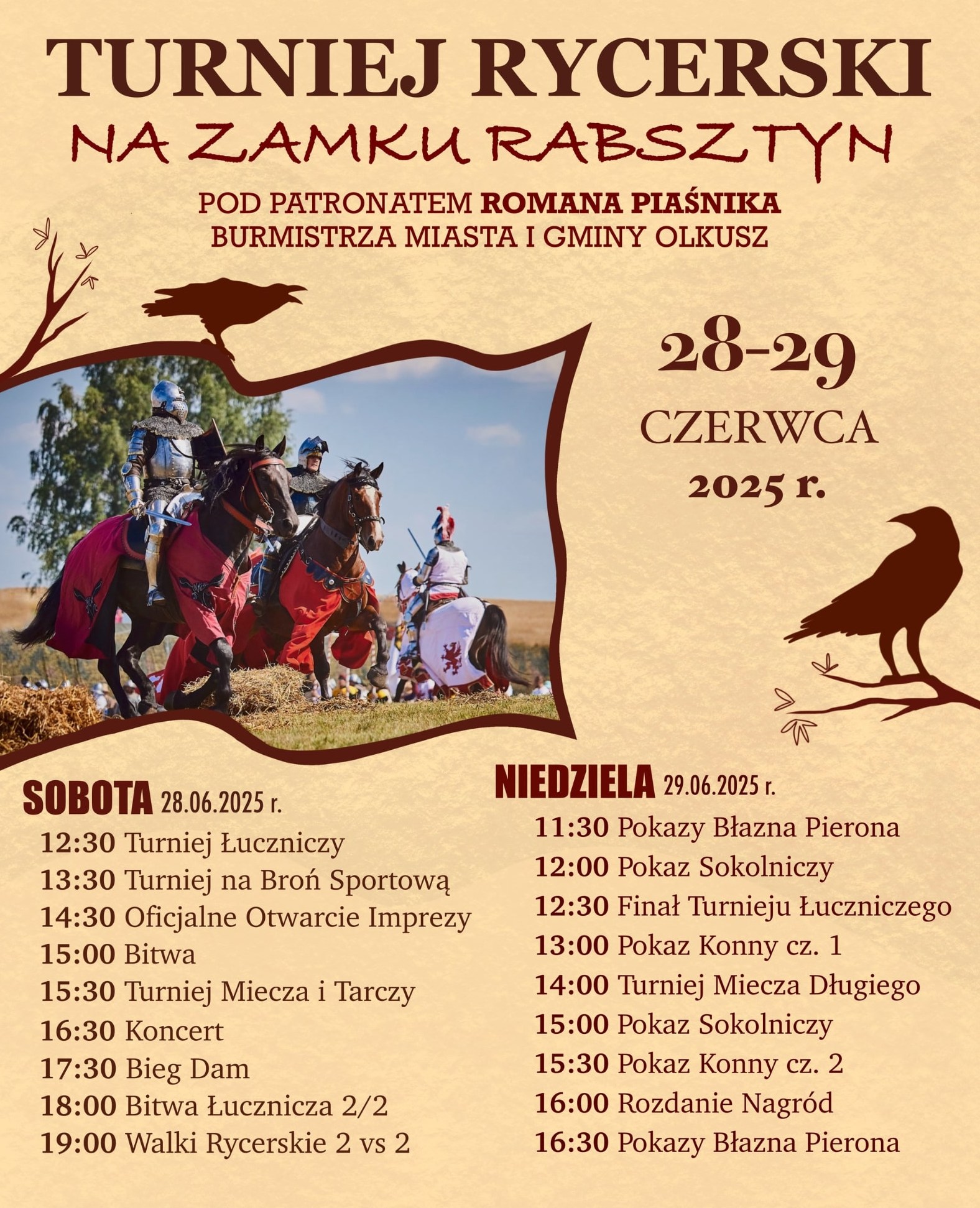 W ostatni weekend czerwca, zarazem w pierwszy wakacyjny weekend, 28 i 29.06. 2025 r. na zamku RABSZTYN koło Olkusza odbędzie się doroczny TURNIEJ RYCERSKI.