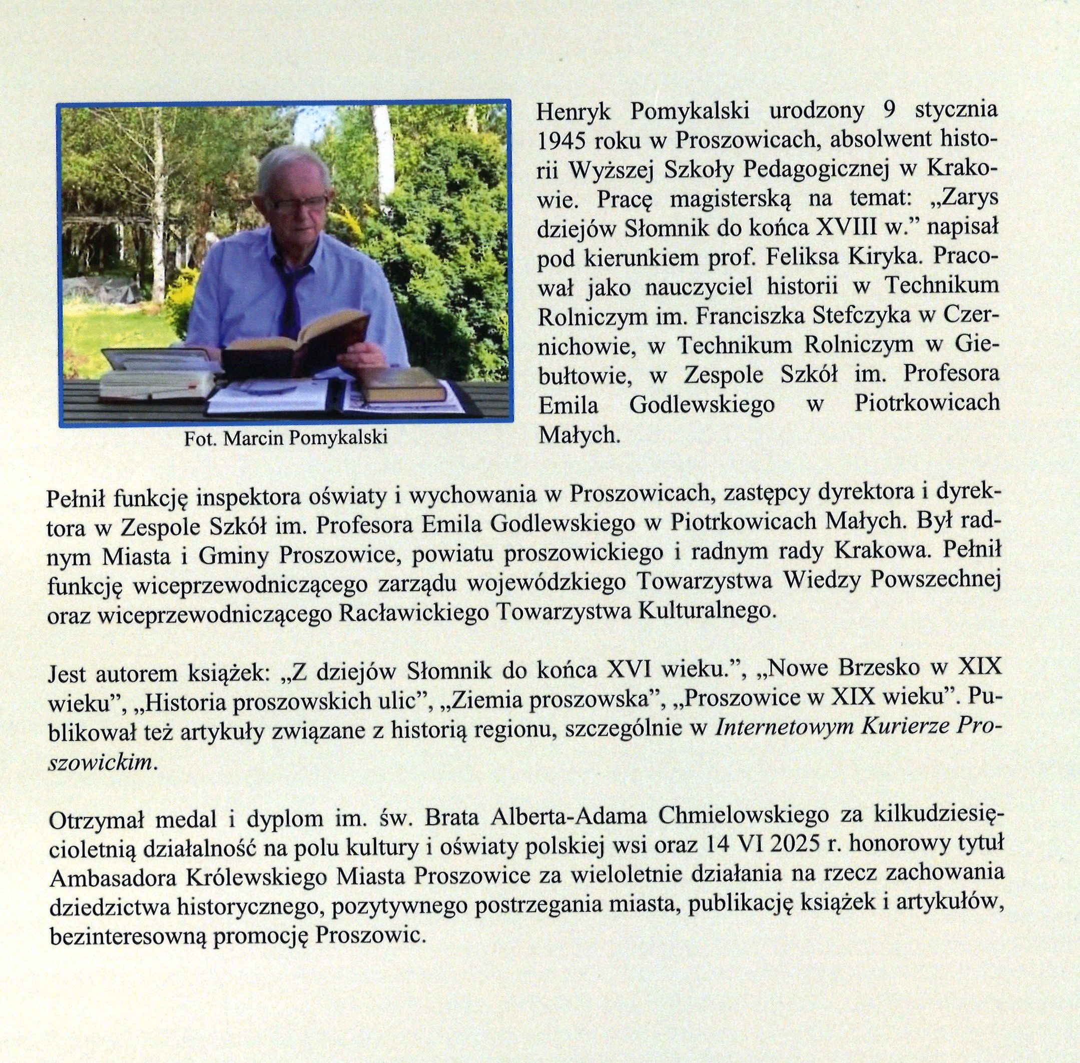 Urodzony w 1945 r. w Proszowicach historyk i regionalista HENRYK POMYKALSKI otrzymał niedawno honorowy tytuł Ambasadora Królewskiego Miasta Proszowice za wieloletnie działania na rzecz zachowania dziedzictwa historycznego, pozytywnego postrzegania miasta, publikację książek i artykułów oraz bezinteresowną promocję Proszowic.