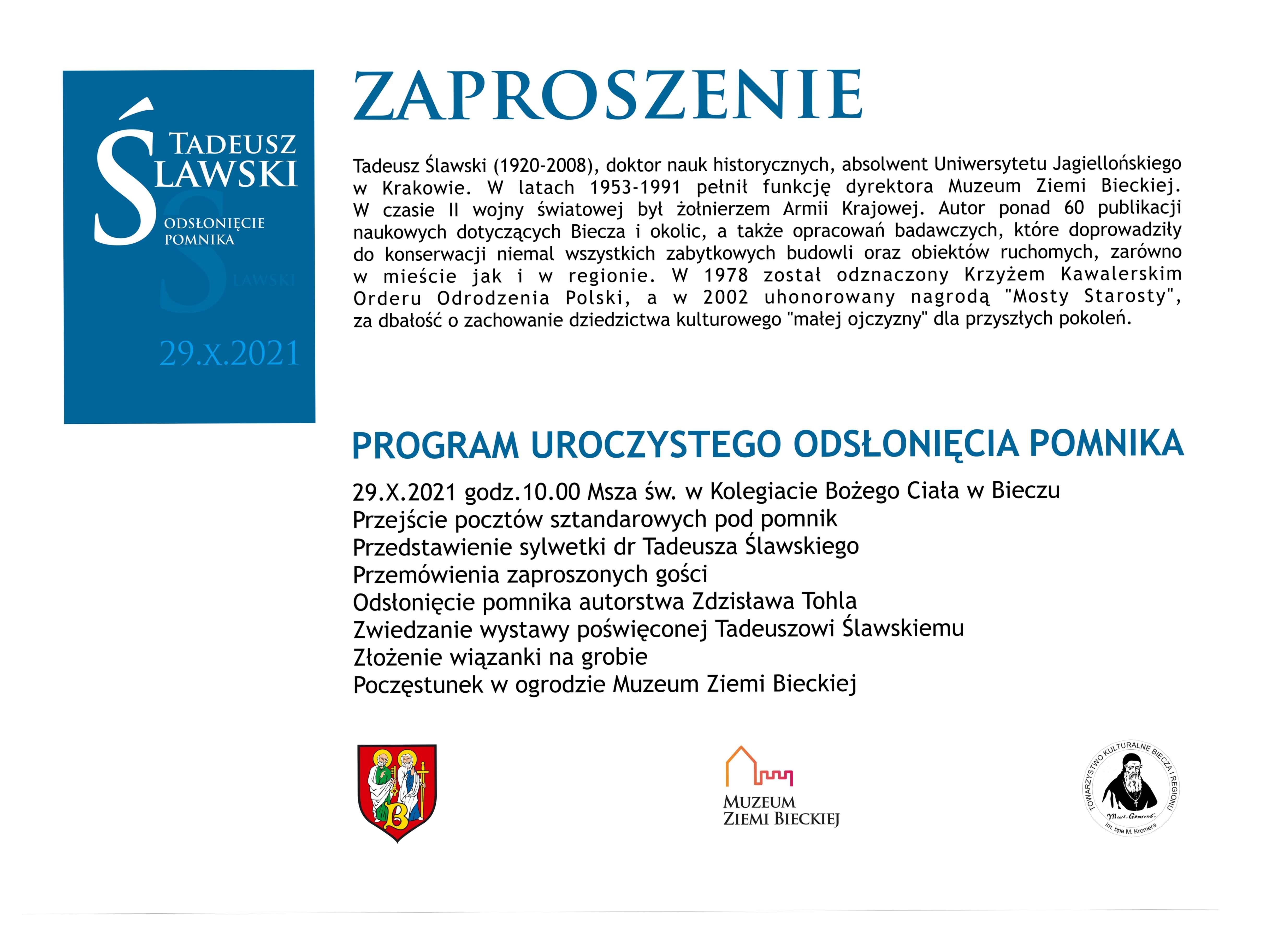 W piątek 29.10 po Mszy św. o godz. 10.00 w bieckiej Kolegiacie pw. Bożego Ciała, na terenie Muzeum Ziemi Bieckiej odsłonięte zostanie popiersie Tadeusza Ślawskiego wykonane przez gorlickiego artystę rzeźbiarza ZDZISŁAWA TOHLA.