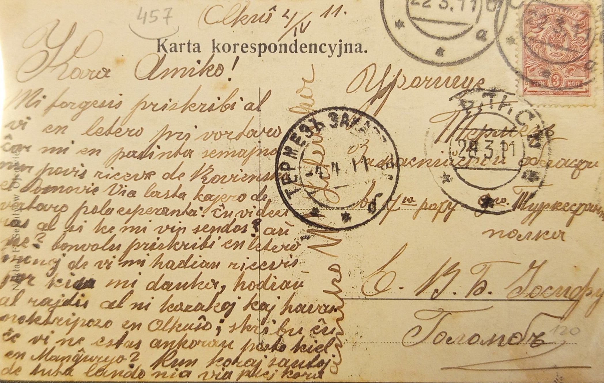 Adres napisany jest cyrylicą, a treść w języku esperanto.