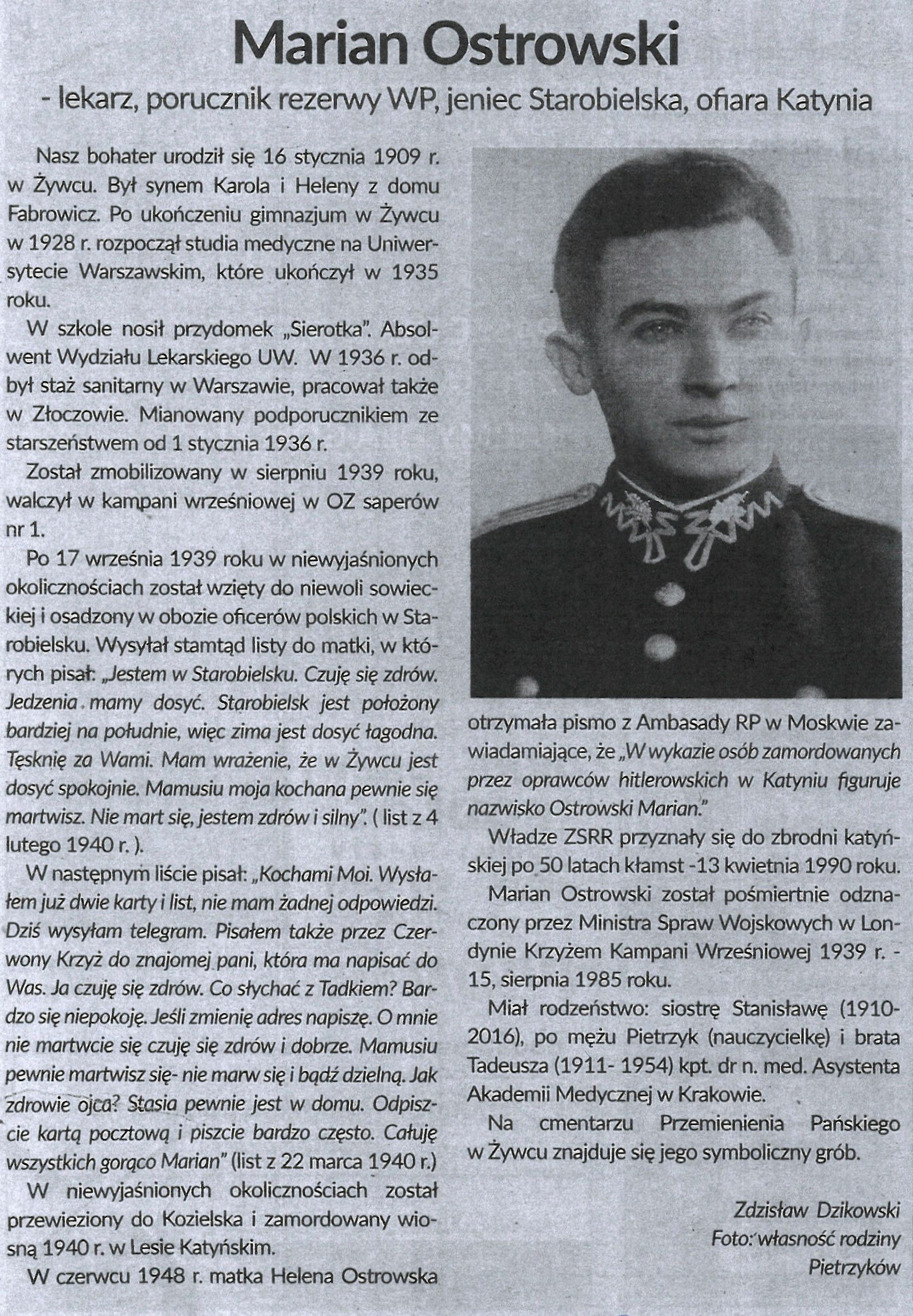 Historyk i regionalista żywiecki ZDZISŁAW DZIKOWSKI przedstawia biogram MARIAN OSTROWSKIEGO urodzonego w 1909 r. w ŻYWCU, lekarza, porucznika rezerwy WP, jeńca Starobielska, ofiary Katynia.