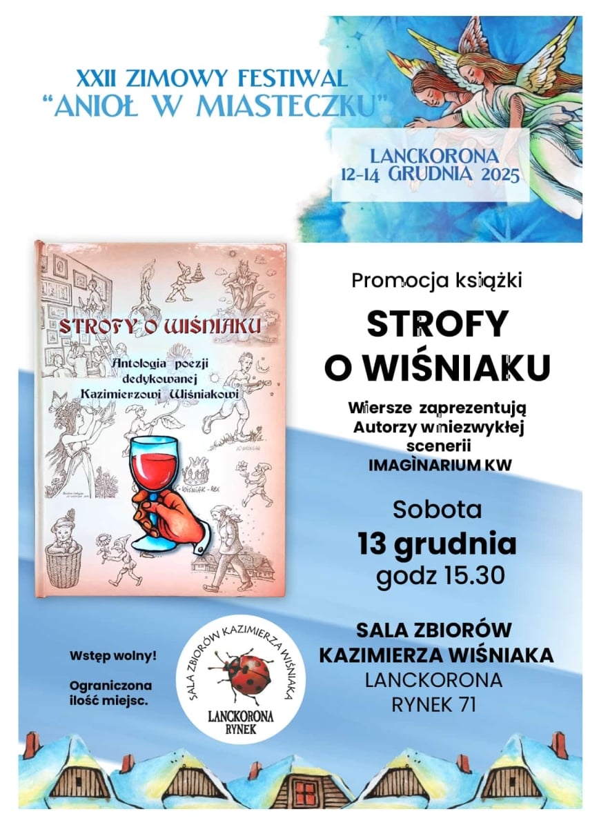 Od piątku 12.12 do niedzieli 14.12. 2025 r. w LANCKORONIE odbędzie się XXII ZIMOWY FESTIWAL "ANIOŁ W MIASTECZKU", obfitujący w wydarzenia kulturalne, eventy, happeningi i zabawę w klimacie między Świętym Mikołajem a Bożym Narodzeniem.