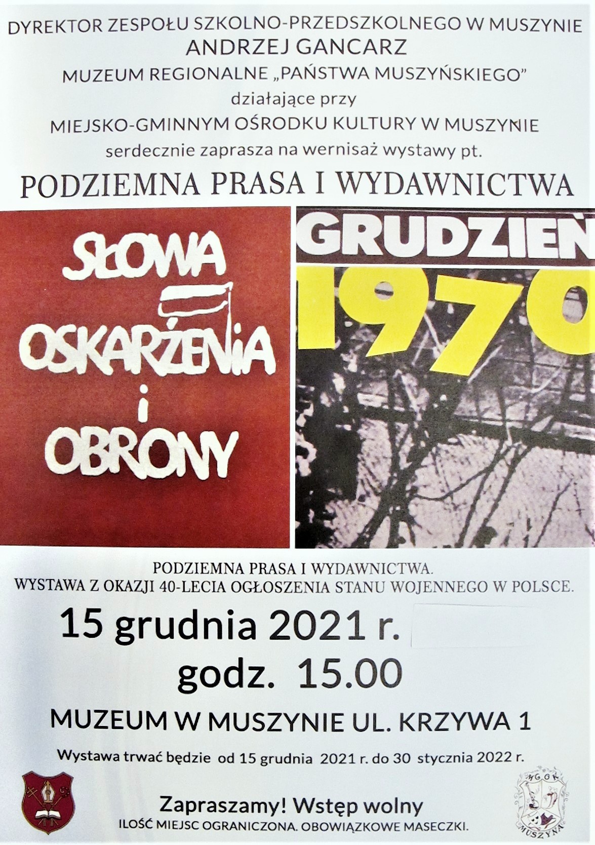 W Muzeum Regionalnym Państwa Muszyńskiego przy ulicy Krzywej 1 w MUSZYNIE czynna jest wystawa "PODZIEMNA PRASA I WYDAWNICTWA", zorganizowana z okazji ogłoszenia 40. lecia stanu wojennego w Polsce.