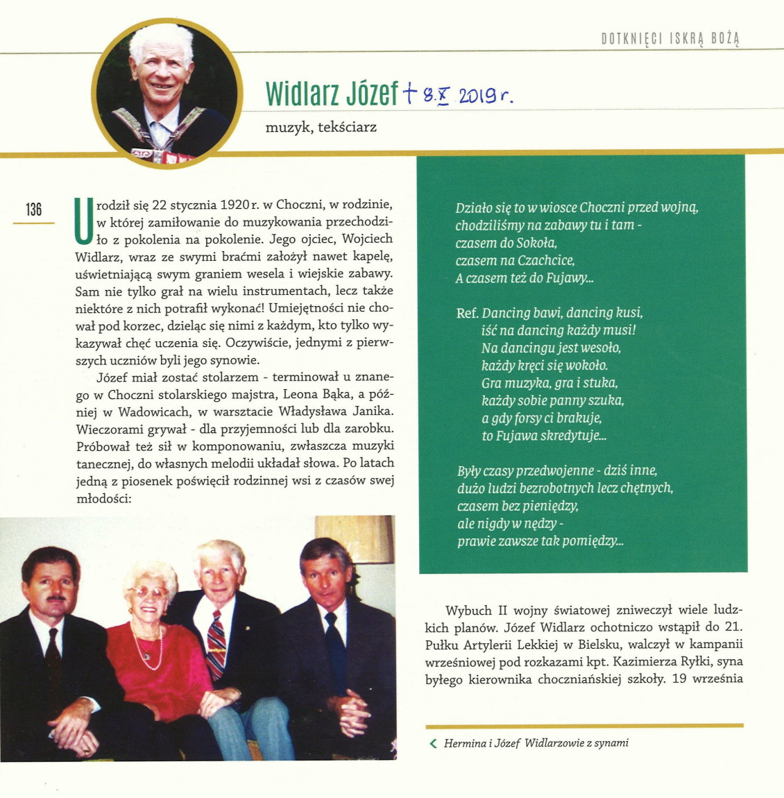 Zamieściła w niej biogram JÓZEFA WIDLARZA (1920 - 2019) muzyka i tekściarza, urodzonego w Choczni, który miał zostać stolarzem, a stał się muzykiem.