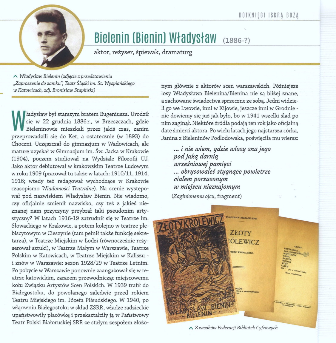 Red. MARIA BIEL - PAJĄKOWA regionalistka i współautorka (wraz z córką AGNIESZKĄ JUSIŃSKĄ) książki "Dotknięci iskrą Bożą - o artystach, twórcach i pasjonatach w dzieje CHOCZNI wpisanych..." tym razem prezentuje życiorys aktora, reżysera, śpiewaka i dramaturga WŁADYSŁAWA BIELENINA, urodzonego w 1886 r. w BRZESZCZACH.