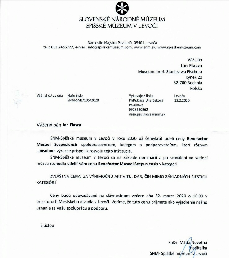 W dowód zasług w niedzielę 22.03. w sali Teatru Miejskiego w Lewoczy Jan Flasza miał odebrać wyróżnienie "BENEFACTOR MUSAEI SCEPUSIENSIS" przyznane mu przez partnerskie słowackie muzeum.