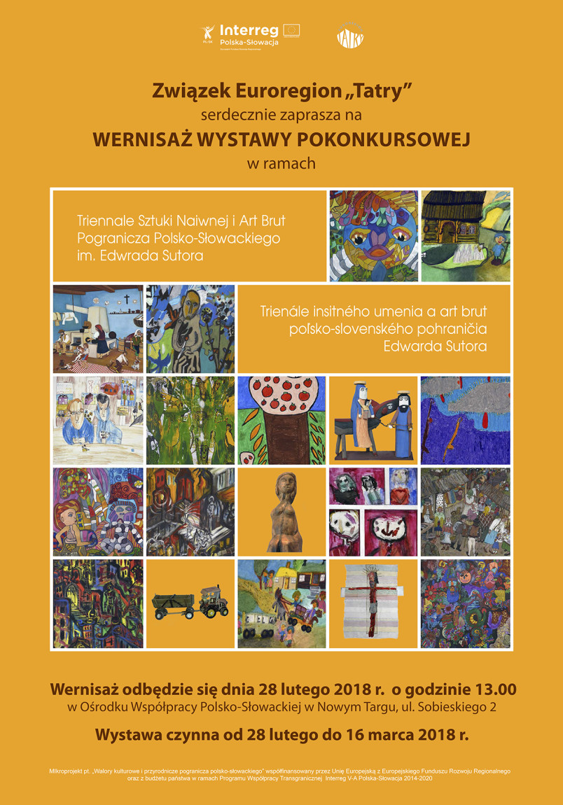 W siedzibie "Euroregionu Tatry" w NOWYM TARGU, w Ośrodku Współpracy Polsko - Słowackiej, czynna jest pokonkursowa wystawa Triennale Sztuki Naiwnej i Art Brut Pogranicza Polsko - Słowackiego im. EDWARDA SUTORA.