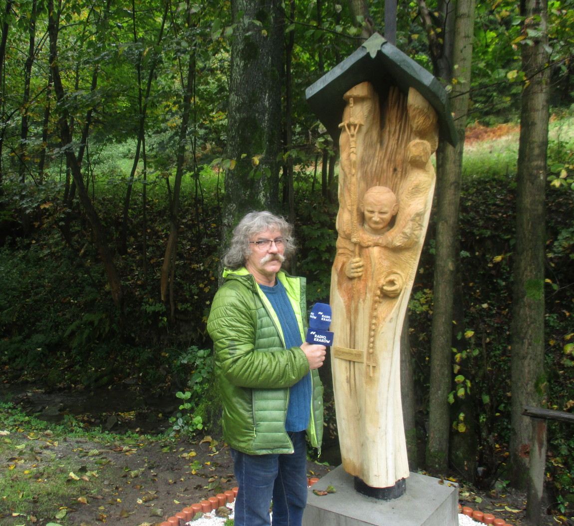 We wsi RZYKI obok starej kuźni, skąd rozpoczynał górskie wędrówki Karol Wojtyła, stanęła papieska kapliczka autorstwa JANA ZIELIŃSKIEGO, przyrodnika, emerytowanego pedagoga z Andrychowa, a także rzeźbiarza mieszkającego latem w przysiółku Rzyki - Jagódki.