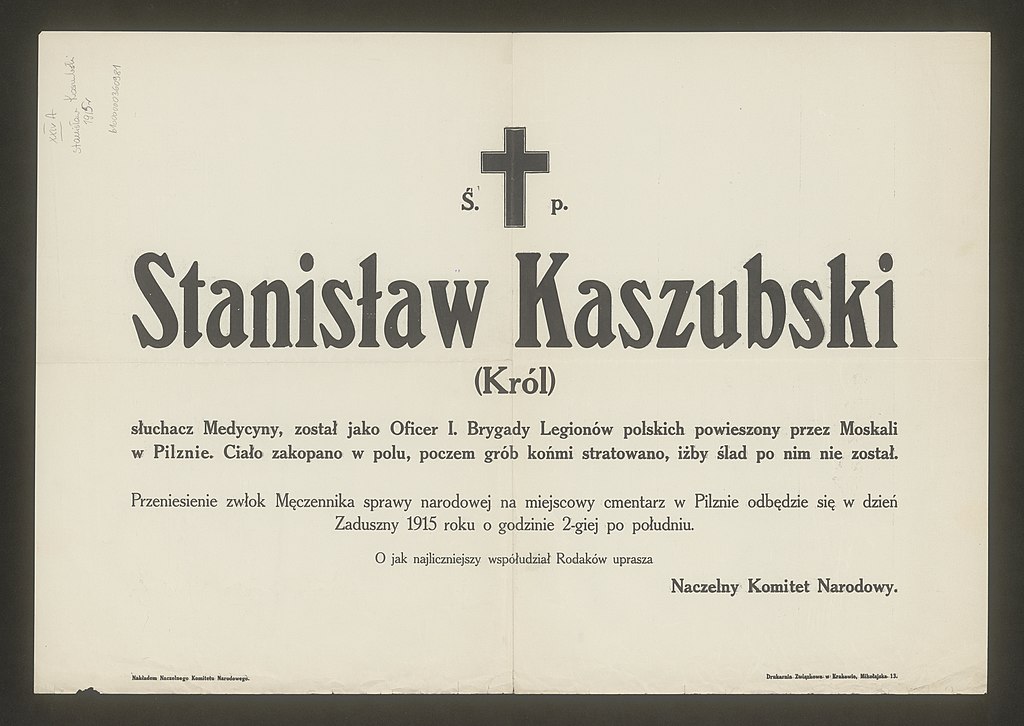 Po aresztowaniu przez Rosjan, gdy odmówił wstąpienia do armii carskiej, STANISŁAW KASZUBSKI został powieszony 7 lutego 1915 r. na rynku w PILŹNIE