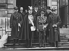 Złożenie listów uwierzytelniających królowi belgijskiemu Leopoldowi III przez posła Michała Mościckiego; mjr Gustaw Łowczowski w grupie dyplomatów pierwszy z prawej; 14 grudnia 1937 r. (fot. Wikipedia Zakład fotograficzny: Photo Acta - Narodowe Archiwum Cyfrowe (National Digital Archives) https://audiovis.nac.gov.pl/i/PIC/PIC_1-D-97.jpg).