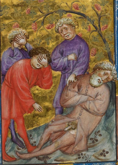 Pijaństwo Noego, miniatura z rękopisu Biblia Pauperum, ok. 1395-1400; British Library, MS Kings 5, folio 15r