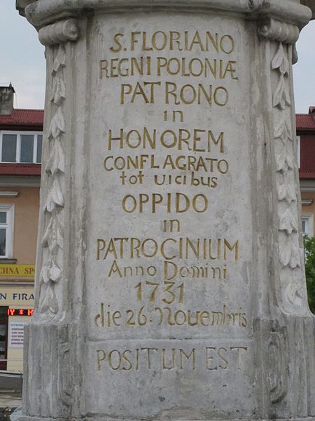 Inskrypcja na postumencie pod figurą św. Floriana w Brzesku