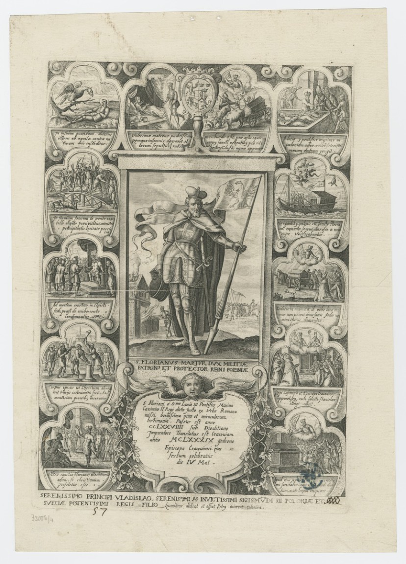 Augustin Braun, grafika Św. Florian oraz 12 przedstawień z życia świętego z wyjaśnieniami (zawiera także sceny związane ze sprowadzeniem relikwii do Polski); z cyklu "Icones et miracula sanctorum Poloniae", ok. 1605-06, Gabinet Rycin, Biblioteka Naukowa PAU i PAN w Krakowie