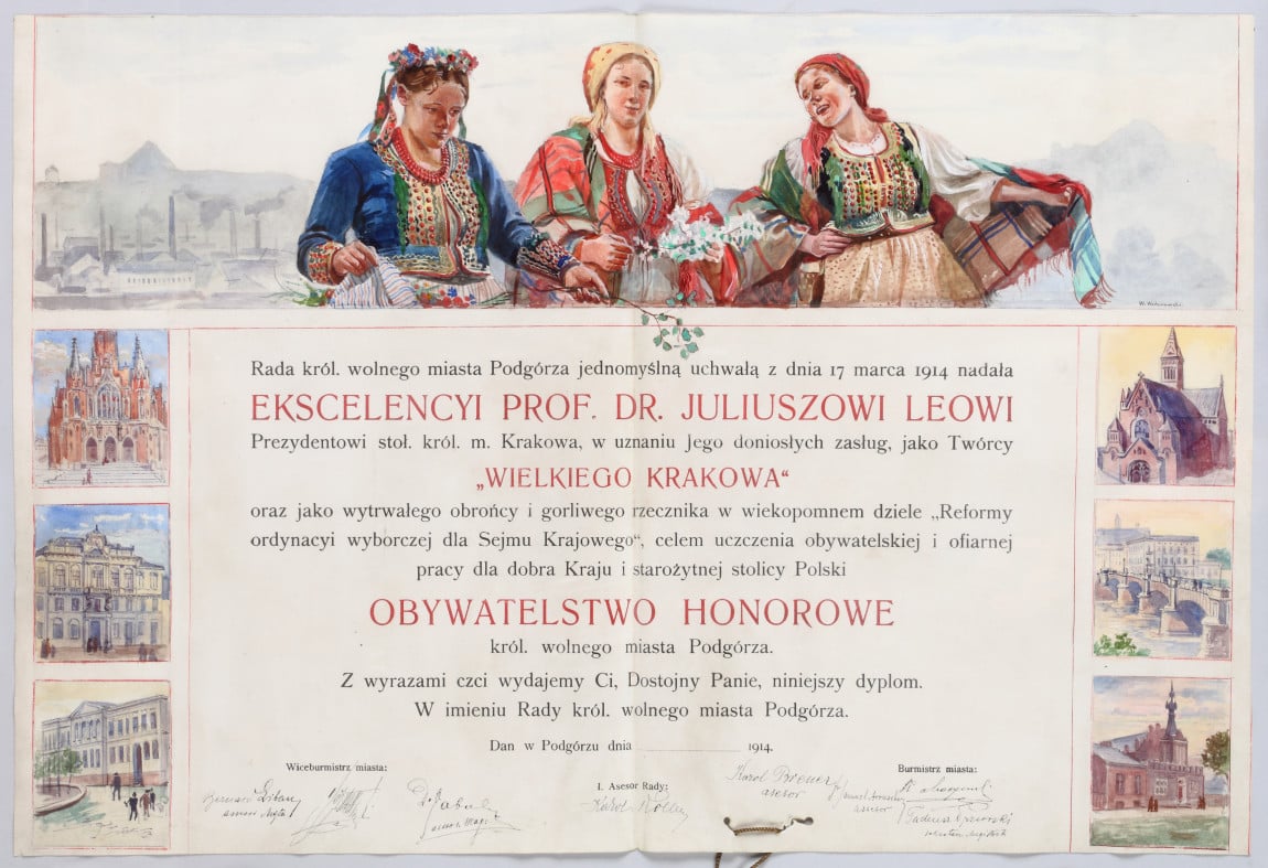 Dyplom Honorowego Obywatela Podgórza nadanego prezydentowi Juliuszowi Leo, 17 III 1914 r., mal. Wincenty Wodzinowski, oprawa Robert Jahoda, nr inw. MHK, Bibl. R.373. Fot. dzięki uprzejmości MHK.