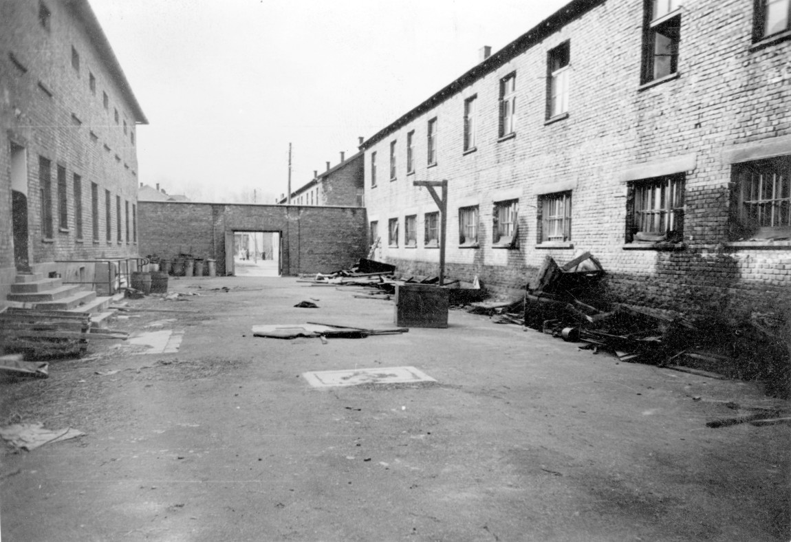 Podwórze i tzw. Ściana Śmierci przed blokiem nr 11 w obozie macierzystym KL Auschwitz po wyzwoleniu 1945 (Archiwum IPN)
