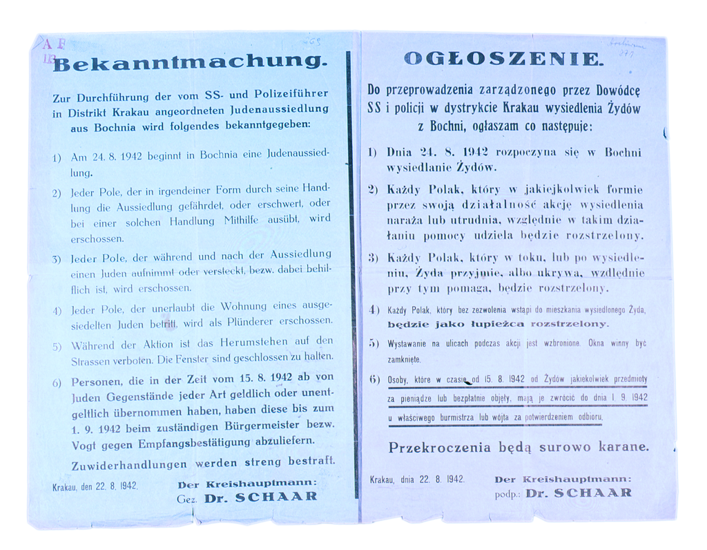 Ogłoszenie o wysiedleniu Żydów z Bochni informujące Polaków o karze śmierci za pomoc okazywaną Żydom. Fot.domena publiczna