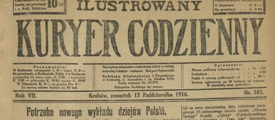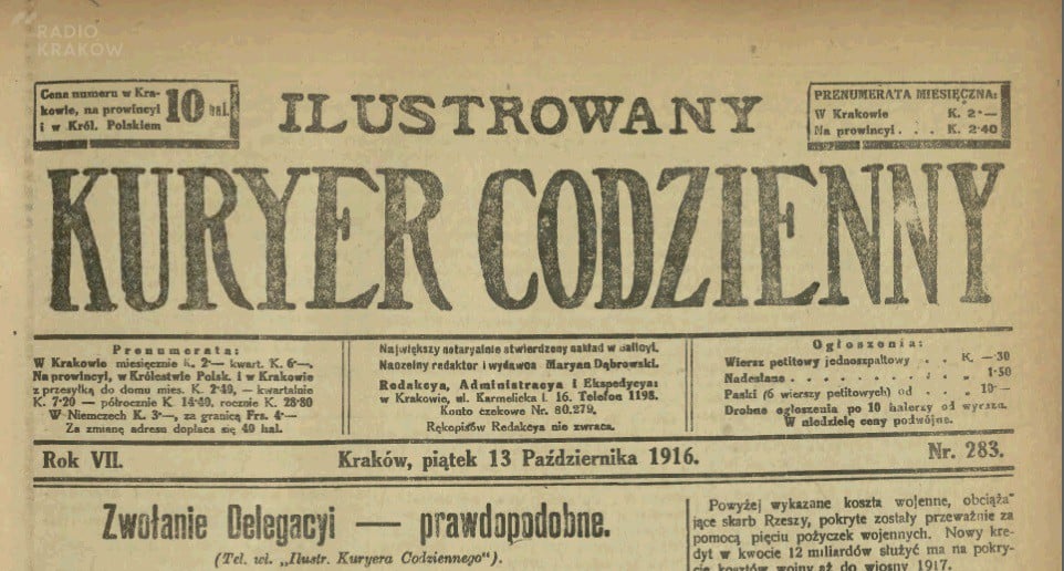 Przez najbliższe pięć dni przeniesiemy się wraz z Państwem do Krakowa sprzed 100 lat. A to za sprawą wiadomości jakie wtedy podawał "Ilustrowany Kuryer Codzienny". Rok 1916 - Albert Einstein ogłasza ogólną teorię względności, korpus medyczny Armii Brytyjskiej dokonuje pierwszej w historii transfuzji krwi, w Monachium powstaje przedsiębiorstwo motoryzacyjne BMW, wydany zostaje rozkaz cesarza Rosji zawierający obietnicę utworzenia niepodległej Polski, ale to dopiero pod koniec roku - 25 grudnia. Te i inne ciekawostki sprzed stu lat usłyszą Państwo "Przed hejnałem" o 11.40.
