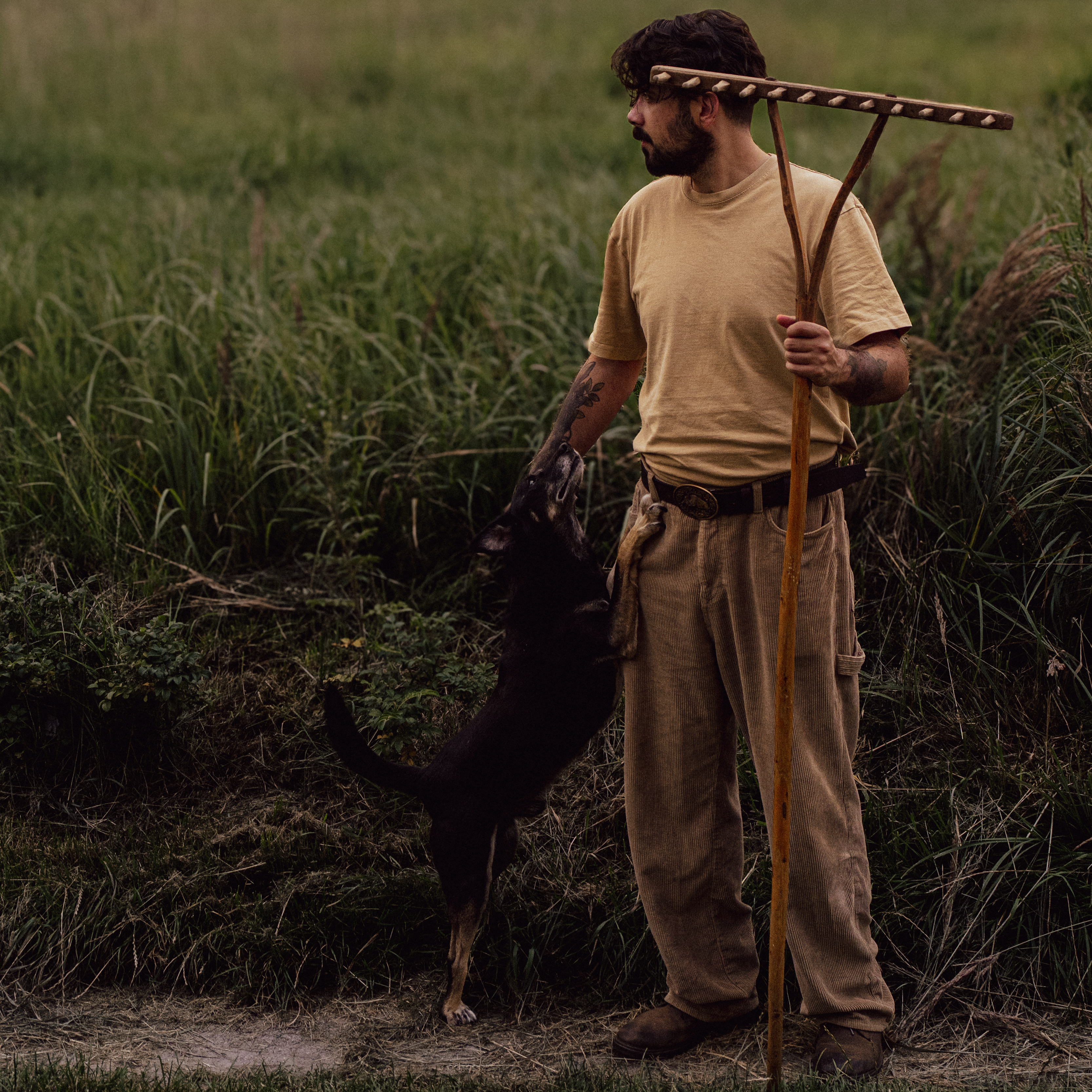 Choć wychował się w Gdańsku, to dziś Dawid mieszka pod Krakowem. Na wieś trafił z własnego wyboru – szukał ciszy, natury i przestrzeni. Tu znajduje spokój potrzebny do pracy i inspiracje zakorzenione w lokalnych tradycjach.W swojej codzienności artysta korzysta nie tylko z igły. Często w rękach trzyma… grabki. To jego ulubione narzędzie ogrodowe, ale też motyw, który pojawia się w tatuażach. Zwykły przedmiot użytkowy staje się symbolem zakorzenienia w wiejskiej codzienności – tak bliskiej ludowej kulturze.