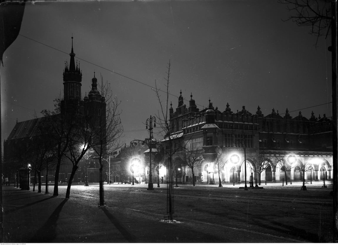 Rynek Główny nocą. Widoczny kościół Mariacki i Sukiennice. Fot. NAC