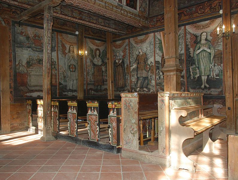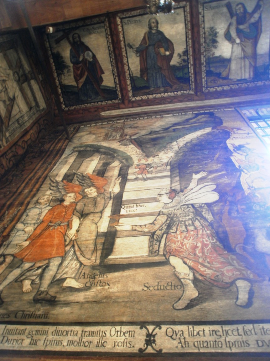 Zachodnio-północny róg nawy w kościele w Binarowej; na ścianach przedstawienia Siedmiu Próśb Modlitwy Pańskiej